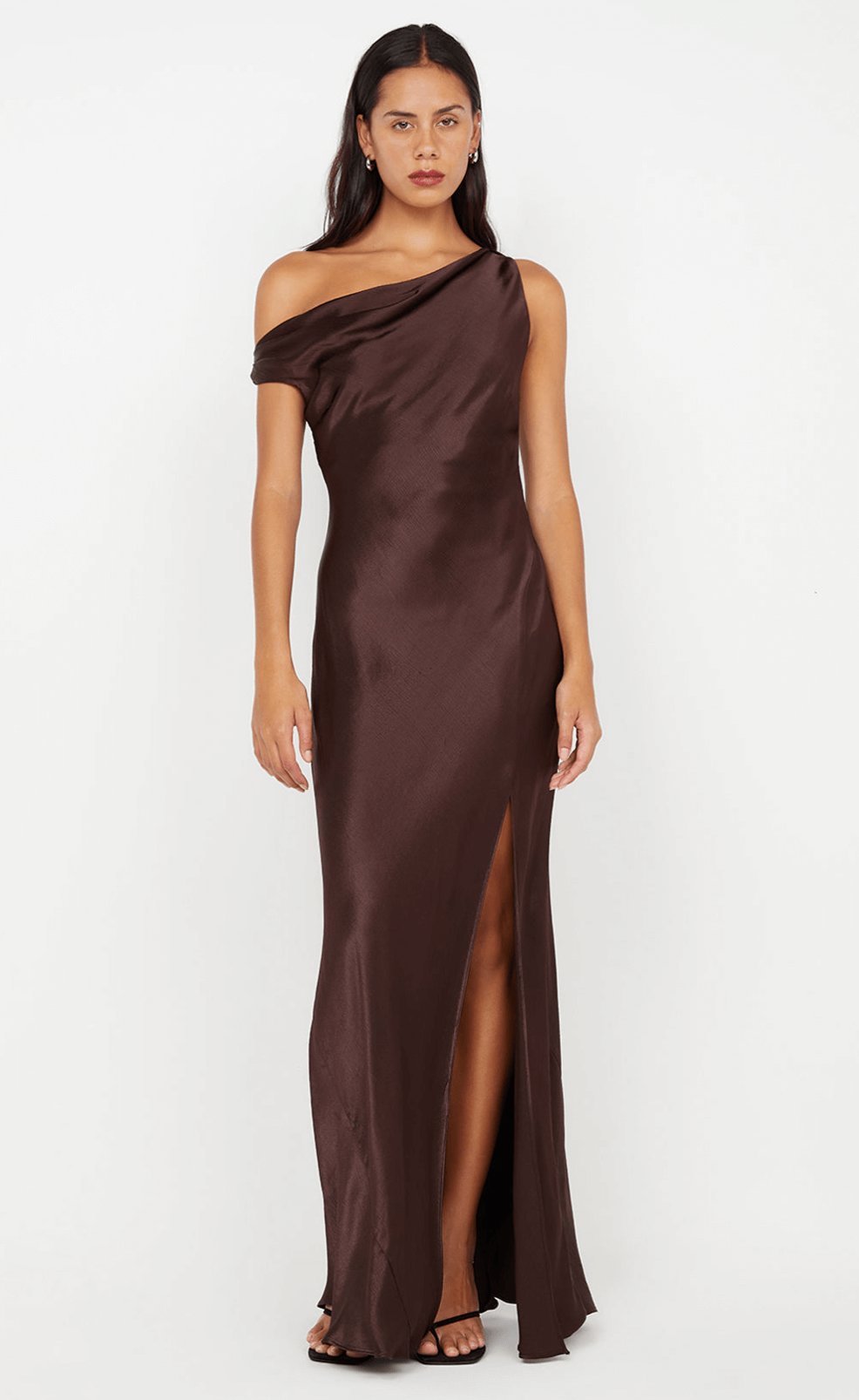 The Sol Asym Dress by Bec and Bridge is sophisticated and flattering, perfect as a bridesmaid dress, for special events, or formal occasions. It features an asymmetrical neckline, bias cut and a mid thigh split. The maxi dress is detailed with bust darts and an invisible zip at side seams.